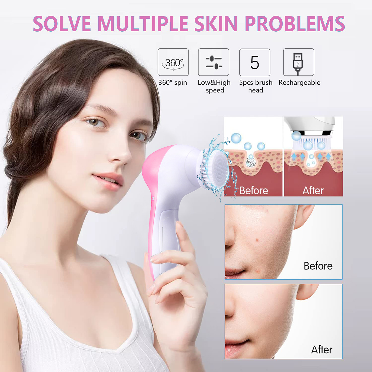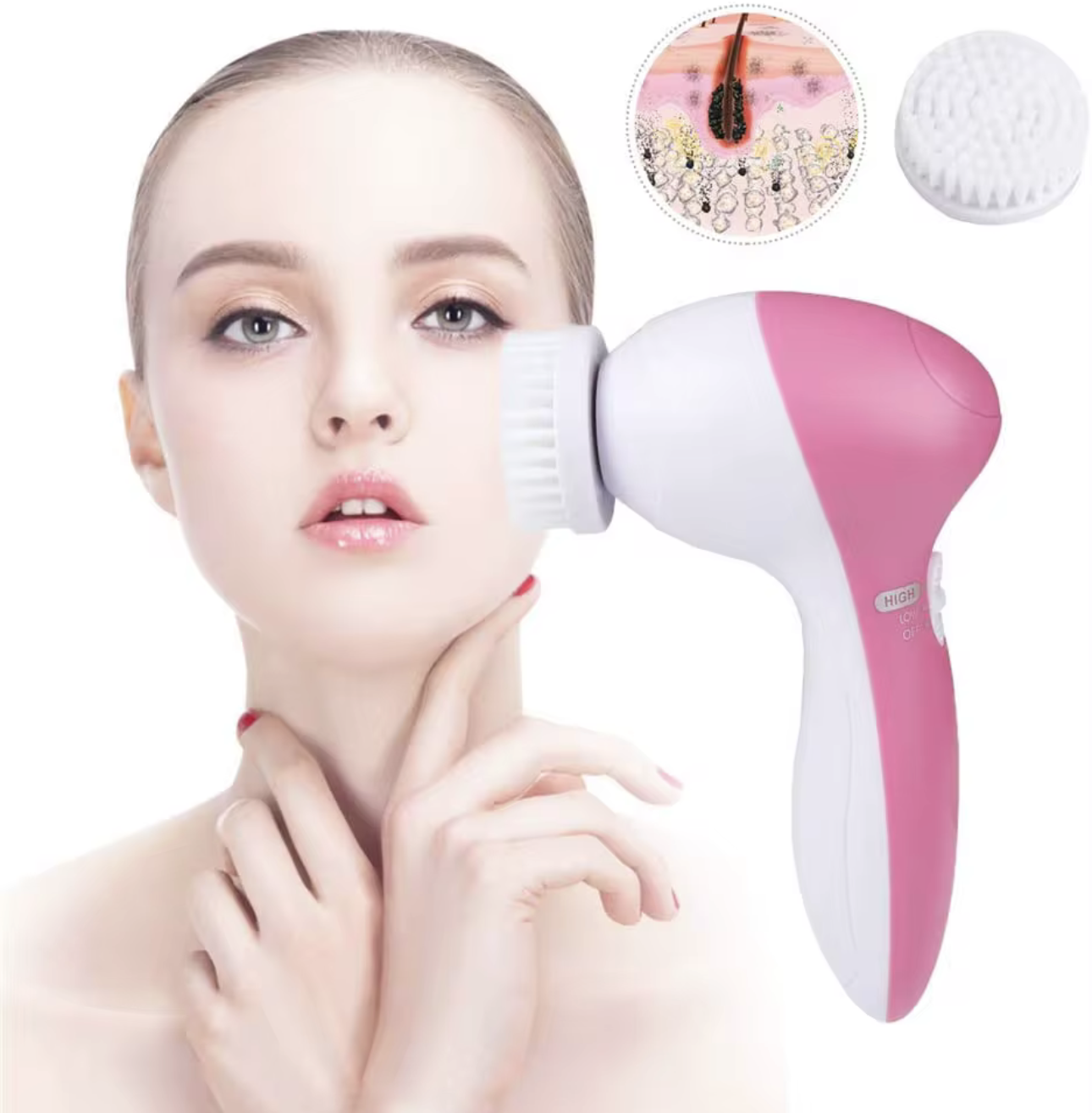 Introducing the 5-in-1 Multifunction Electrical Facial Cleansing Brush – your ultimate companion for transforming your skincare regimen into a luxurious experience. This innovative handheld device is meticulously crafted to tackle a variety of skin concerns, making it an essential tool for anyone looking to enhance their complexion.