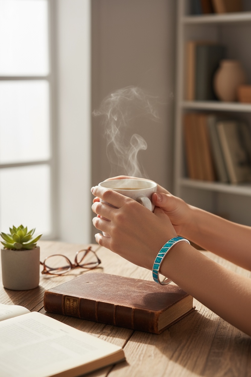 Adorned with stunning gemstone inlays that showcase a rich palette of blues, alongside striking accents of green and delicate pink, this bracelet evokes the enchanting colors of the ocean’s depths. Each gemstone is thoughtfully selected, ensuring that this bracelet is not merely a fashion statement, but a unique work of art that carries its own narrative.