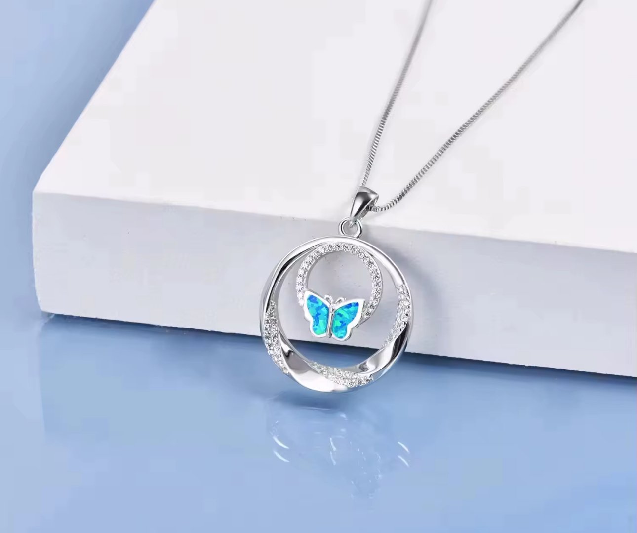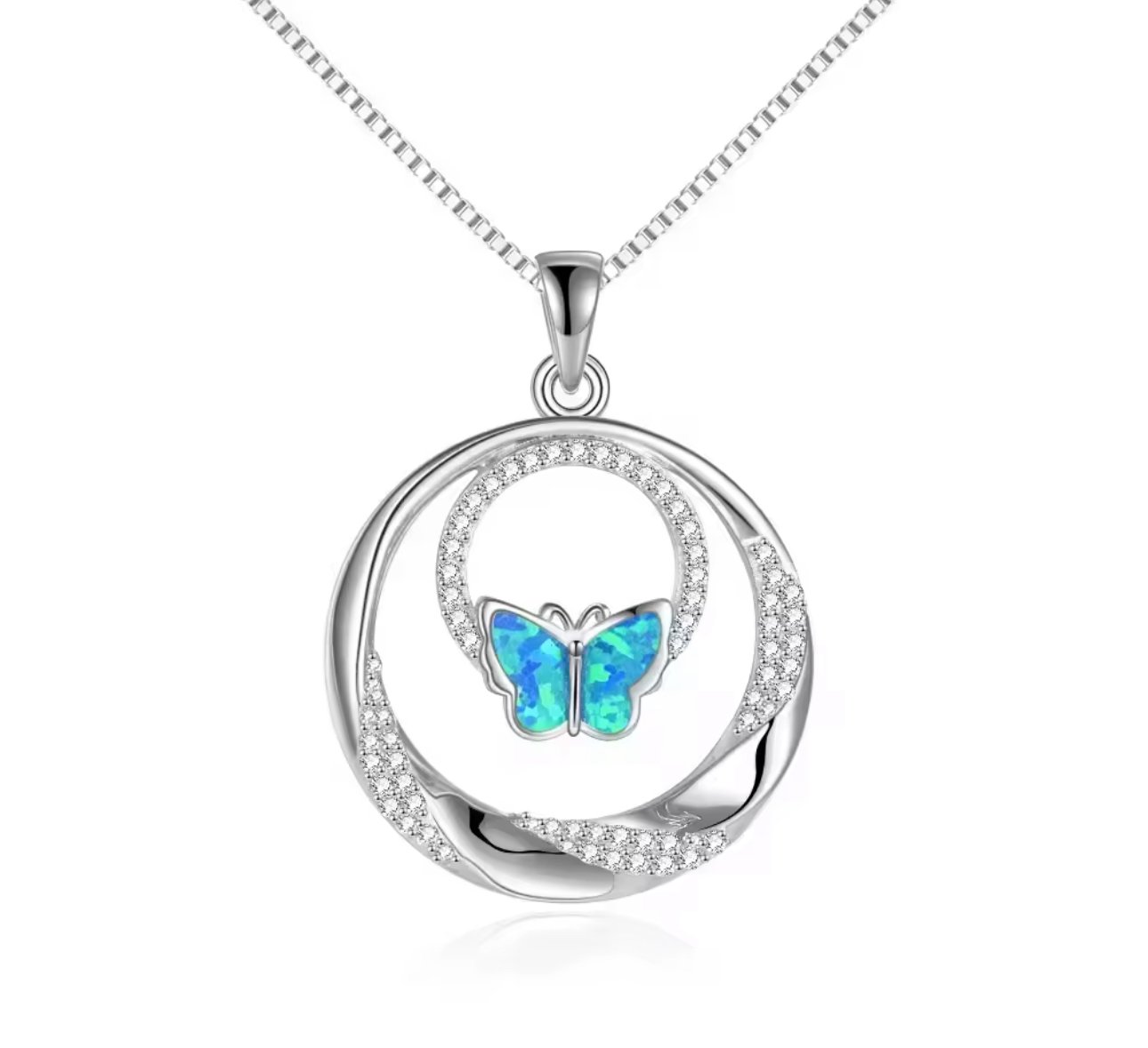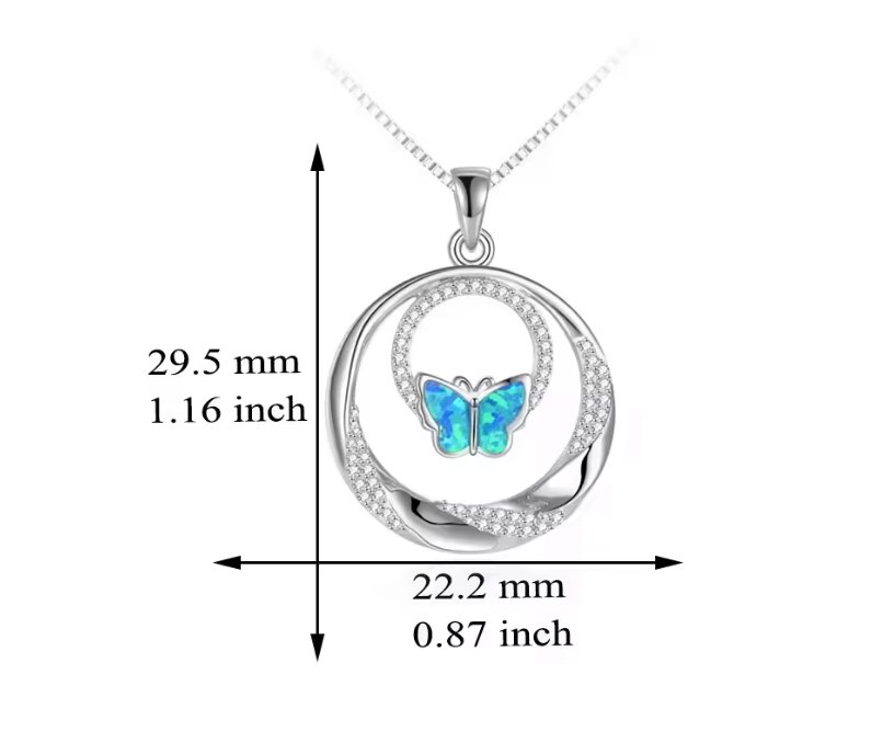 Elevate your style with this exquisite necklace featuring a delicate butterfly pendant, masterfully crafted from 925 sterling silver and enhanced with a luxurious rhodium plating. The enchanting double zircon circles shimmer gracefully, catching the light at every angle, while the opal centerpiece radiates a captivating play of colors. This piece is not just jewelry; it’s a statement of elegance and artistry that will surely add a touch of whimsy and grace to any outfit.