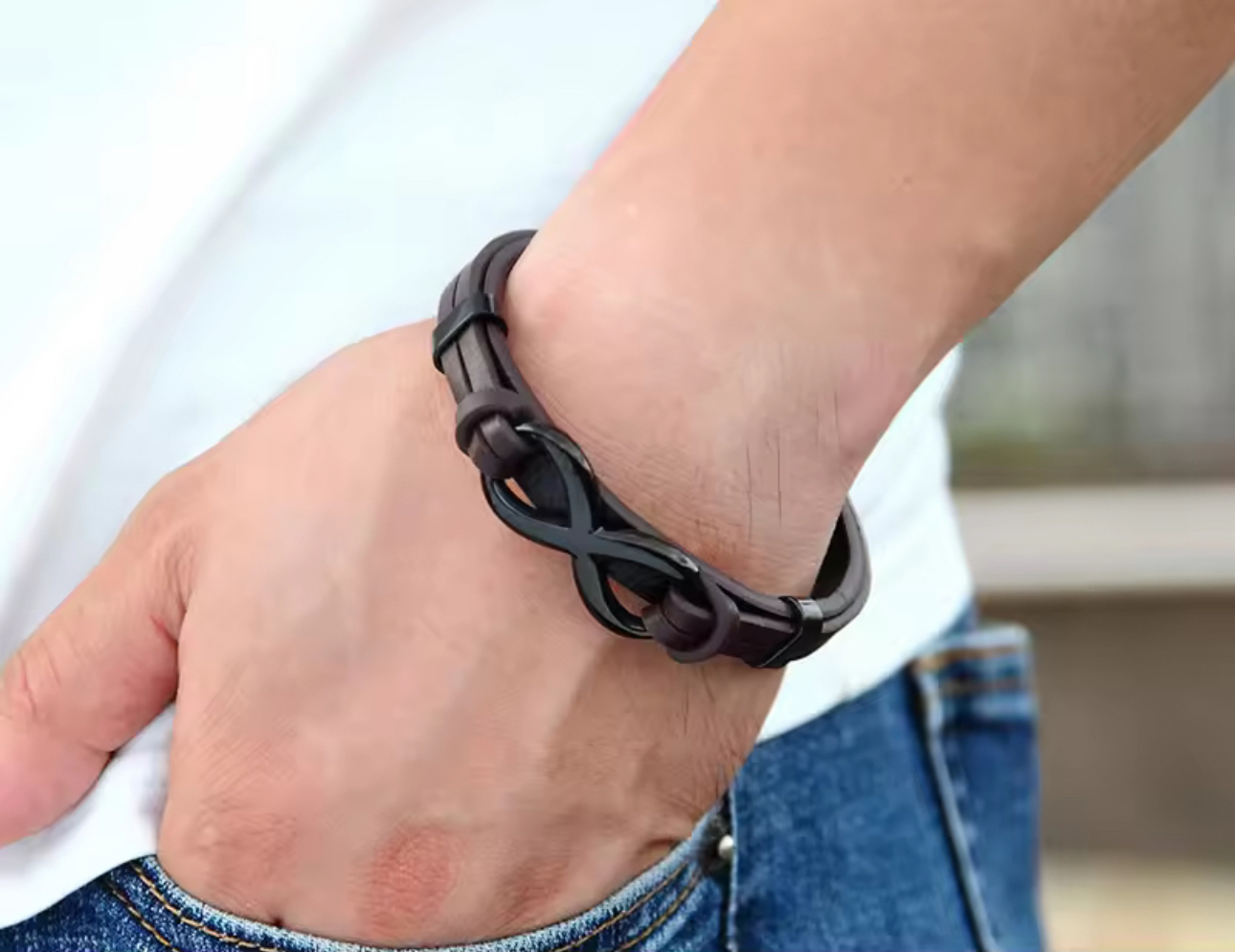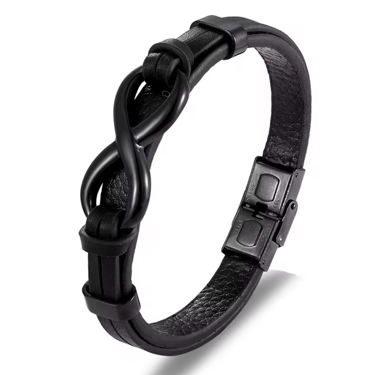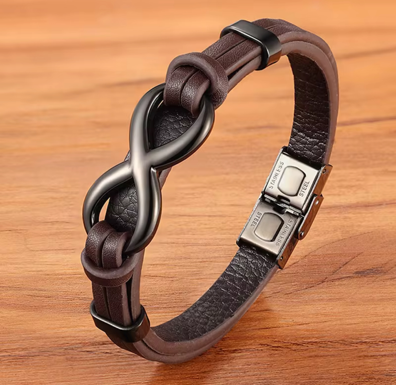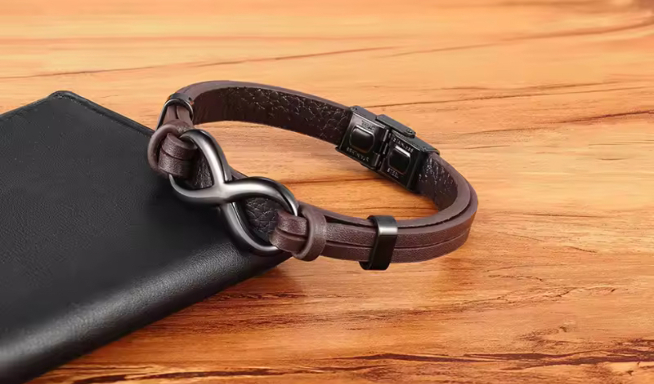 Elevate your style with our stunning Men’s Infinity Charm Bracelet, meticulously crafted from high-quality stainless steel and authentic leather. This striking accessory boasts a robust, wide design that seamlessly merges strength with elegance. The genuine leather infuses a touch of sophistication, providing a comfortable yet luxurious feel. At the centre of this eye-catching piece lies an infinity charm, symbolising eternal bonds and resilience. Perfect for those who wish to make a bold statement, this bracelet transcends mere adornment; it serves as a true expression of your unique personality and fashion sensibilities.